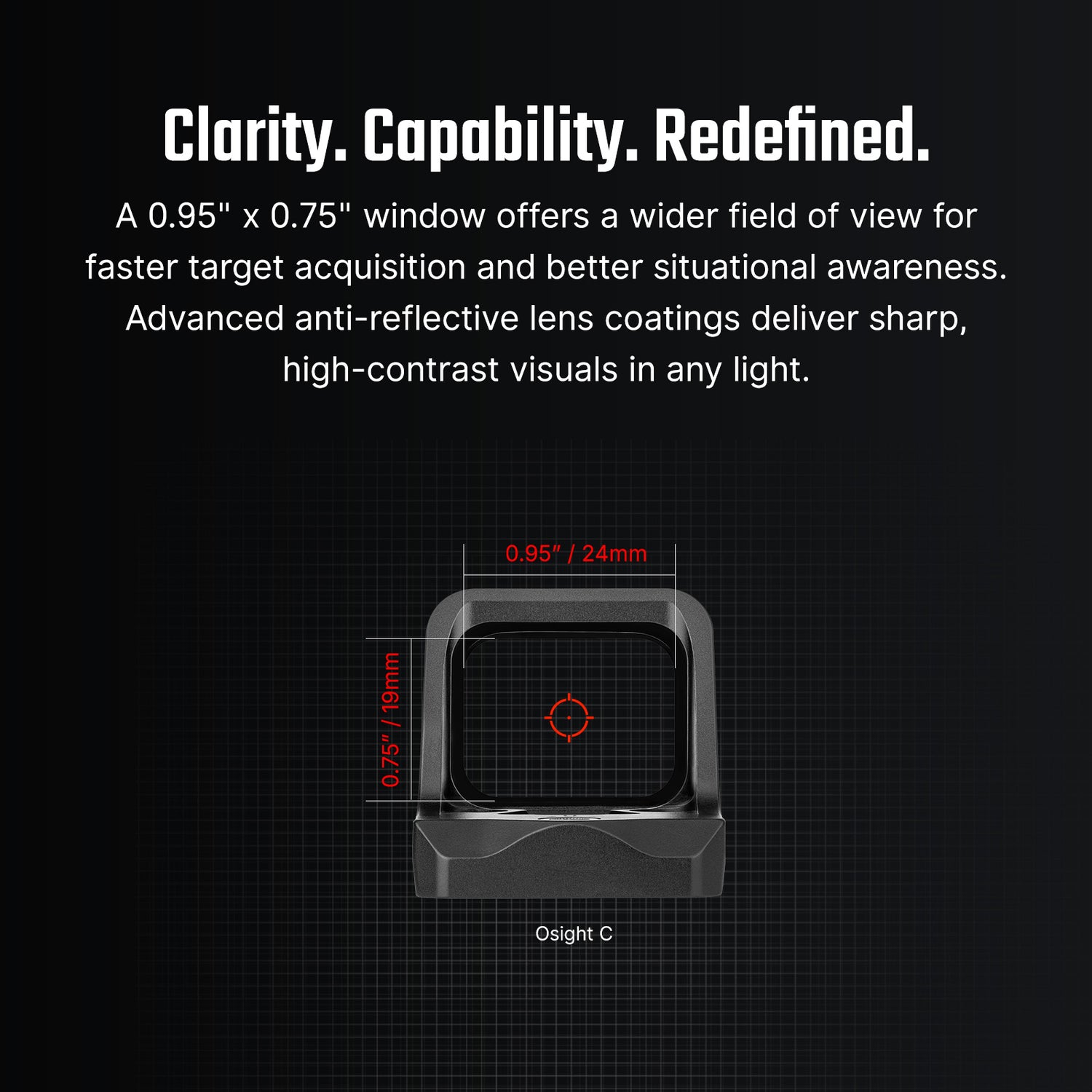 Osight C paneb iga lasu keskmesse selguse, kiiruse ja enesekindluse. Ere ja lai vaateaken kiirendab sihtimist, nii et sihtmärgid ilmuvad hetkega. Vaheta retikleid vastavalt olukorrale—alates täpsest sihtimisest kuni kiirete üleminekuteni—samal ajal kui nutikas liikumisandur hoiab optic ready ärkvel, kui sa oled, ja säästab energiat, kui sa ei ole. Patarei vahetus on lihtne ja ei häiri nullimist. Tänu oma tööstusstandardile jalajäljele sobib Osight C ilma probleemideta paljudele püstolitele ja pikkadele tulirelvadele.