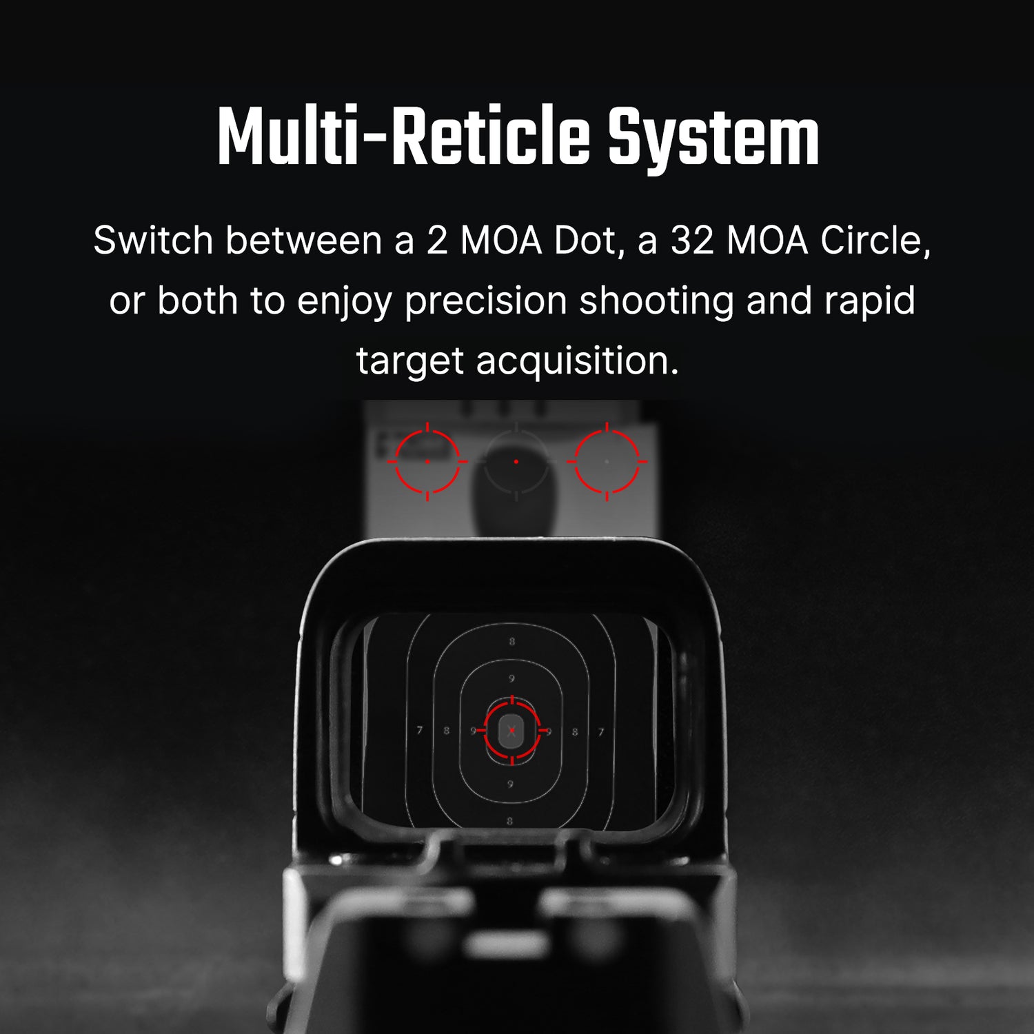 2 MOA täpp & 32 MOA ring: Valige täpi-ja-ringi, ainult täpi või ainult ringi retikulite vahel, et saada terav ja ere sihtimislahendus igas laskmisstsenaariumis.
